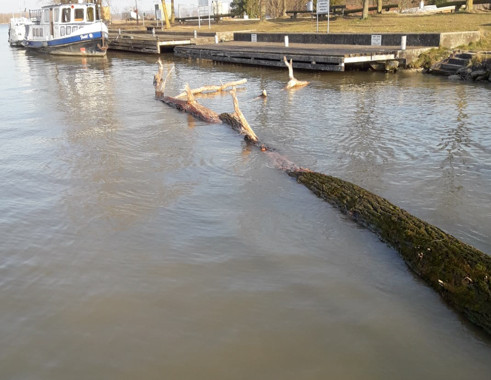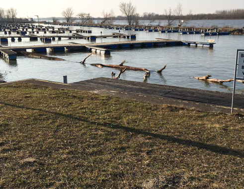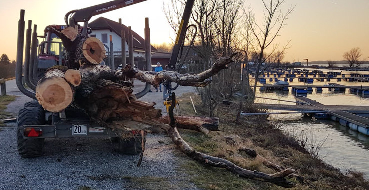 Ein großer Baum wurde durch das Sturmtief in unser Hafenbecken gespült. Der Baum verkeilte sich innerhalb der Steganlagen und konnte dadurch einen erheblichen Schaden an unserem Steg anrichten. Ein Team unserer Wehr zerkleinerte den Baum in mehrere Teile um sie im Anschluss mit einem Ladekran aus dem Wasser zu heben.